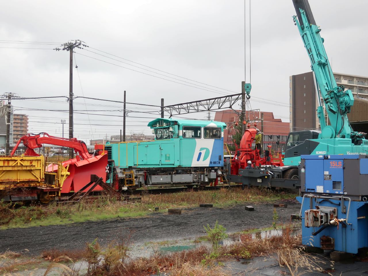 この機構を通じてモータカーから除雪装置を駆動、操作する動力が伝えられます。3枚目の写真は、さらに移動して作業のほぼ全体像を撮影したもの。中央の青っぽい車両が「モータカー」。その左側にはラッセルヘッドを装着済。(拡大写真(別ウィンドウ、1280×960))