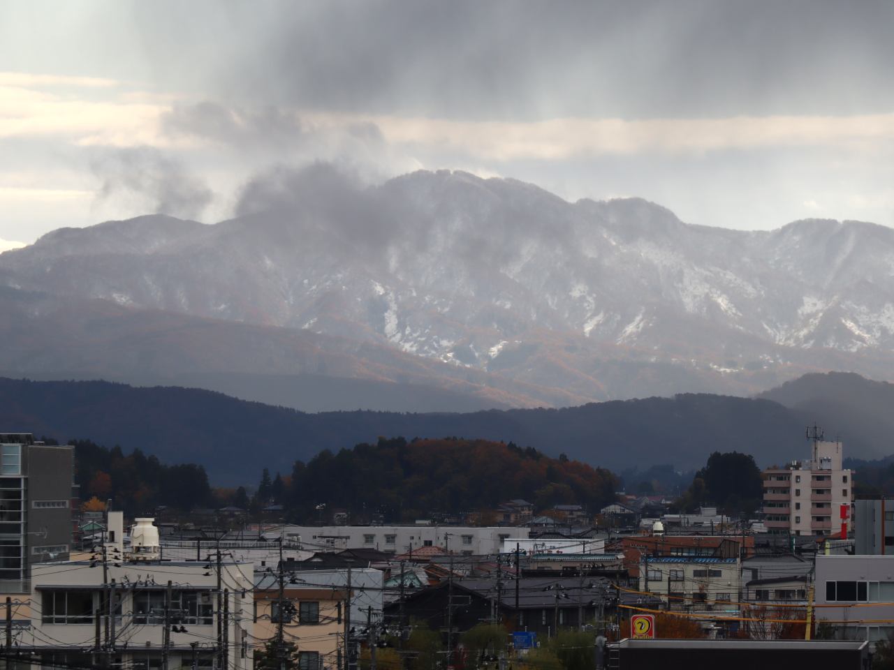 ご覧のように5合目くらいから上は真っ白。標高をおよび気象状況──湿度ほぼ100%で飽和している──を考えると、撮影地より4℃くらい低い。つまり山腹は雪と霙が混じったもので、山頂部付近はほぼ完全な雪。