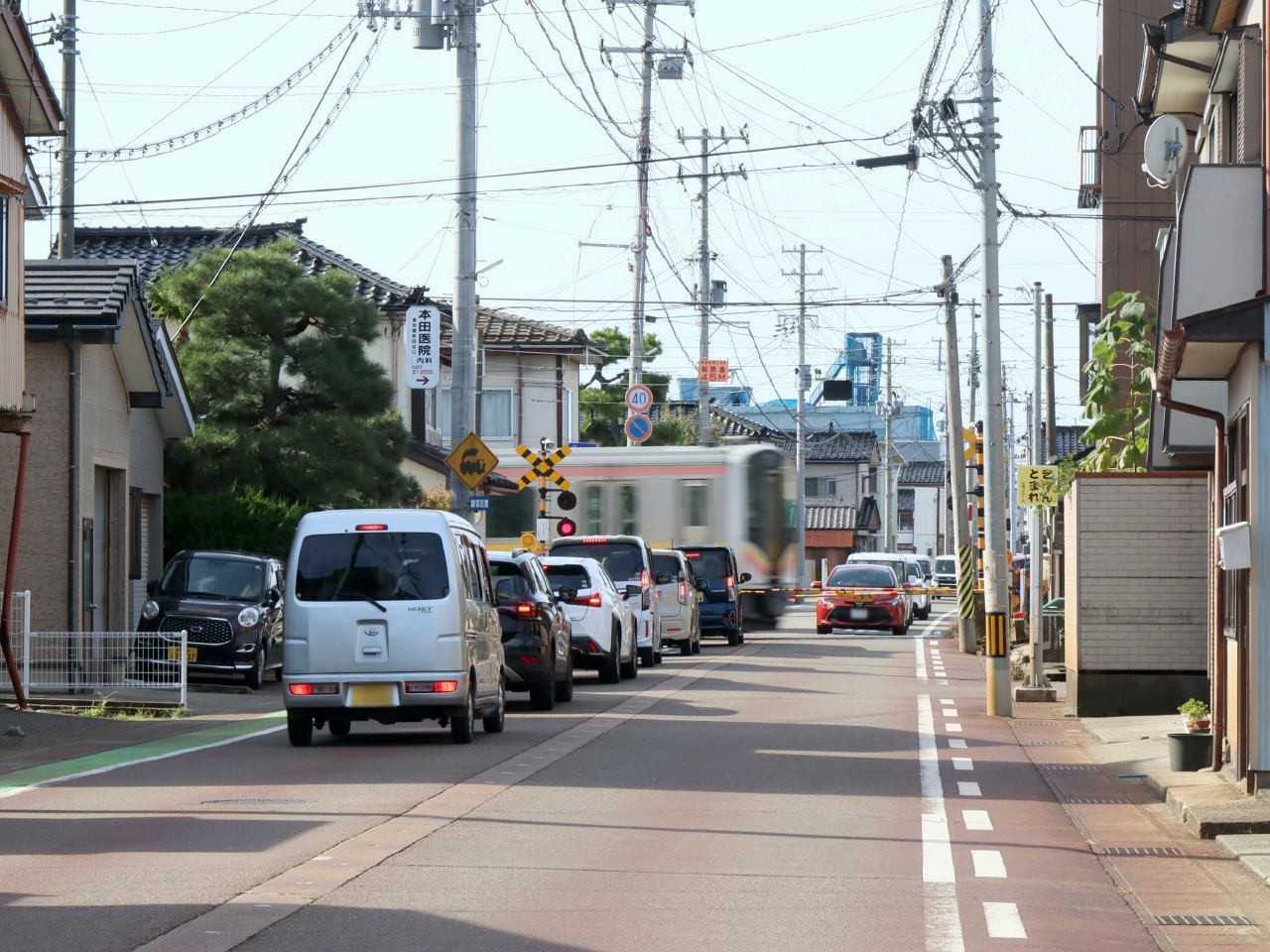 このような理由でこの「比角踏切」を通過する列車は極めて低速。踏切はあちこちに存在しますが、大半は列車が轟音を立てつつ高速で通過。だからこの「比角踏切」で見る電車の印象は、ふだんの姿と大きく異なります。