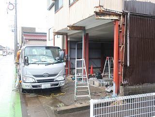 ここは以前ご紹介(こちらやこちら)した、傾いた家の前なのです。折れ曲がった円柱状の支柱はすでに撤去されています。作業を少しだけ拝見させていただくと何と、角柱状の鉄柱をトラックの荷台から運んで、スポスポと嵌め込んでいきます。