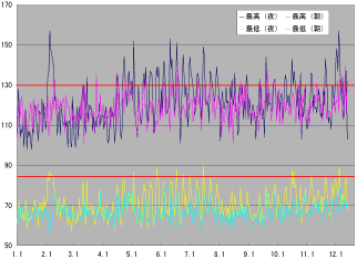 なおグラフ右端近くの12月初旬の上昇は先週の東北ツアーと続く講義、そして実家でのストレスによるもの。だからある意味、これらの血圧変動を納得できるのです。ただしここで見逃すことができない点が。変動幅の拡大だけでなく、9月中旬以降はフロアレベルが緩やかに上昇しています。