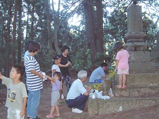 西村家のお墓はお寺にではなく、集落を見おろす小高い丘の上にあります(江戸時代まではこの形式が多かった)。総勢12名の賑やかな(?)お墓参りでした。センセイはすぐに自宅に戻ったのですが、たぶん実家は昨晩、大宴会だったのでしょう......。