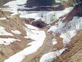 この間、まったくの谷底を線路として使っています(!!)。当時は線路脇に排水路があったのでしょうが、現在は本来の姿(?)に戻り、一面が川原になっています。特に現在は雪解け水が多く、ここを本当に列車が走っていたのかと思うほどです。冬季間は雪が多かったでしょうし、もしかしたら四方の山からの雪崩があったかもしれません。それまでして鉄路を守っていた先人の努力に頭が下がる思いです。