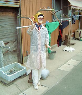 実はこの主婦(?)、マネキンなのです! そして雨の降らない日は毎日(!!)ここに立っているのです。それもお召し換えしながら!!!!