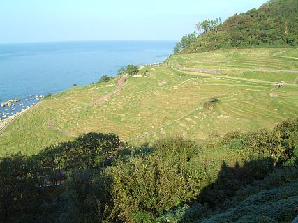 北向きの斜面に向かって、小さく細い田圃がずっと繋がっています。センセイの下手な写真より、実物はずっときれいです。