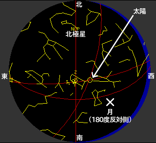 前者を大潮、後者を小潮と言うのですが、聞いたことのある方も多いでしょう。で、問題の、昨日の13:00ころの位置関係を示したものが右の図です(空の明るさを消しています)。