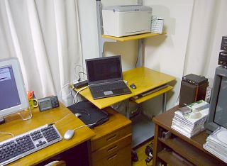 右の写真、中央部上からエプソンのモノクロ・レーザープリンタ、黒いWindowsノート、その右に私物のMacintosh PowerBook G4(チタン1GHz)があります。
