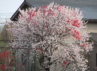 それに写真の中の左の木、ご覧のように一つの木に紅白の花が同時に咲いています。