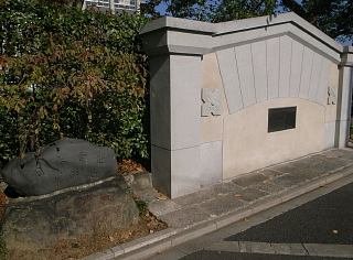 小さなお弁当で元気になった西村センセイ、同志社大学新町校舎を出ようとして、背の低い石碑(写真左側)に気づきました。掘ってある文字を追うと、「日本電池 發祥地」。
