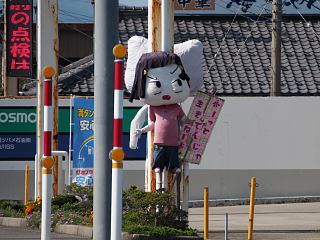 半年くらい前から、写真の大きな人形がお客さんを誘導(?)しています。ずっと、さくらももこさんの「ちびまる子」ちゃんだと思い込んでいたのですが...あれっ?