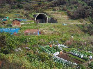 窓の外を見ていると突然、廃墟のような光景に何度か出くわします。写真はその一つ。山形県の小岩川駅を過ぎた時、右前方(ほぼ北)を見たもの。丁寧に耕作された畑の向こうに、ポッカリと大きな穴。もちろん列車用の複線トンネル。出入り口は柵で覆われています。