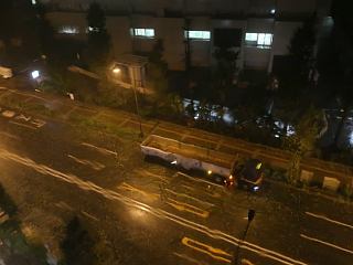 窓の下に見えるのは、片側3車線の本郷通り。道路の反対側、灯りが点いているビルは東京医科歯科大学。窓および窓の外は尋常ではない音を立てています。雨が窓ガラスにへばり付き、映像が歪んでいます。