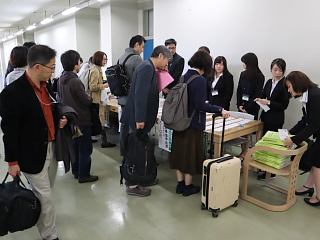 5時過ぎから、学内外の学会関係者と6名の学生に手伝っていただき、作業開始。本当はその時の現場の様子をお伝えするつもりだったのですが、指揮する側にまったく余裕がなく、写真は解散後に撮影した受付付近の様子。