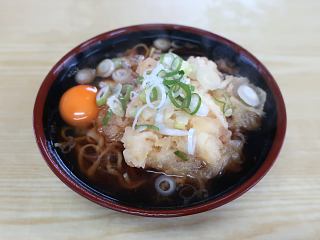 念のための確認になりますが、「かけ中か」──ただし券売機の表記は「中華」──に玉葱だけの天ぷらと生卵が入ったものです。