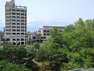今日の勤務はないので、式典が終了すると多くの方は帰宅します。ほとんど誰もいなくなったキャンパス、先ほどとほぼ逆の、高い位置から中庭を撮影したのが写真。