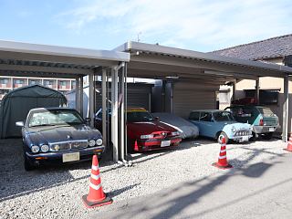 というわけで正体不明の1台を除けば、イギリス車2台、イタリア車2台。日本で相対的に人気があるドイツ車と、大柄のアメ車はなし。良く見ると、各車の背後には別な倉庫が。右側のシャッター付のものに自動車を収めるのは難しいと思いますが、もしかしたらジャガーの後ろはパイプ車庫かも。