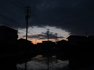 目を転ずると天に対応するように、地上にも「動き」が。暗くて良くわかりませんが、目の前は田圃です。10日くらい前、つまり連休中に植えた苗が、しっかりと根を下ろしています。「活着」と呼ばれる状態。大気も、生き物も、そして季節もしっかりと動いています。