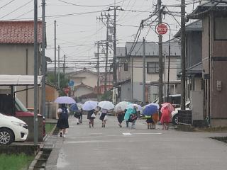 残念ながら途中で、降りが一段と激しくなりました。写真はアパート近くで撮影したもの。登校途中の小学生です(左端は中学生)。雨が降っているため、少し煙(けぶ)っています。傘の花がずいぶんカラフル。