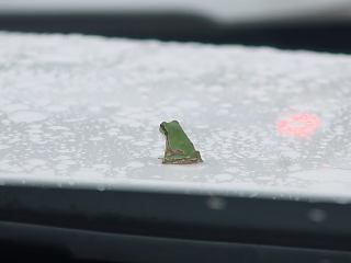でも帰宅後に雨が強くなり、今日はずっと雨。というわけで今日は自動車にします。荷物があるので助手席のドアを開けると、何故か席の前に小さなモリアオガエル。開けた時に入り込んだようです。