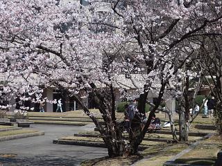 キャンパスに戻り、中庭脇を通り過ぎようとした時、目に入ってきたのは中庭中央にある桜の木。五分か七分咲きくらいで、間もなく満開になろうかというところ。よく見ると、その下を含めたあちこちに、学生のグループ。