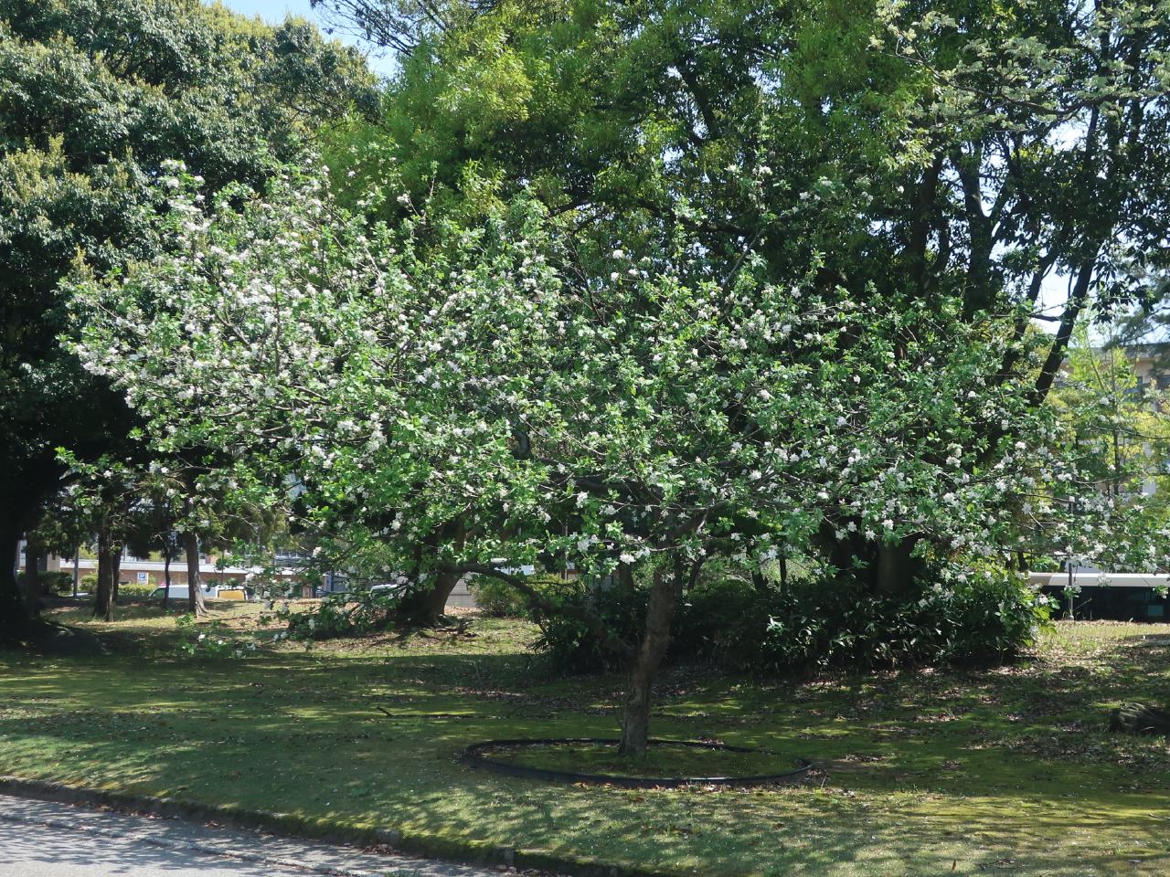 出勤してまず撮影したのはキャンパス中央に植えられている「ニュートンのりんごの木」。先週1輪だけながら開花したことをお伝えしましたが、それが満開になったのです。