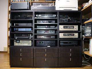 昨夕の時点での機器類配置状況が右の写真。今回は拡大写真(別ウィンドウ、1280×960)付です。知っている人が見れば仰け反るであろう機器も含まれていますが、若い方にはたぶん、何が何だかわからないと思います。ま、いいんですけど。