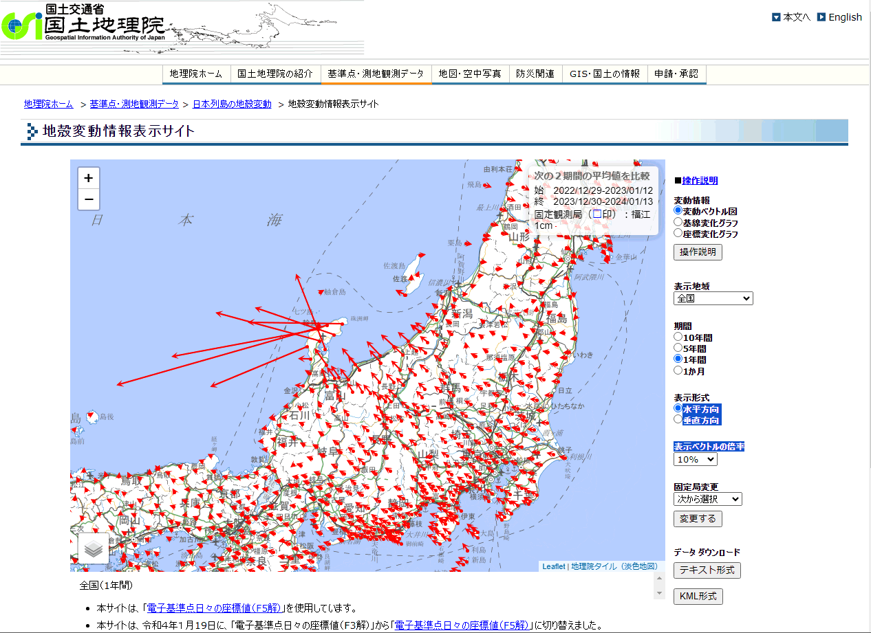 地震前後での地殻の動きが、一目瞭然。このサイト、反応の鈍さが難点ですが、有益な情報を得ることができます。図は水平方向だけですが、垂直方向の動きも表示可能。それによると、今回は逆断層型の変動だったため、能登半島を中心として日本海側は概ね隆起。