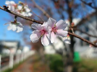遠くに花弁(はなびら/かべん)が見えたような。駆け寄ってみると、やはり桜の花です。しかもそれなりの数。周囲の大きく育ったった桜の木は、葉を落とすところ。
