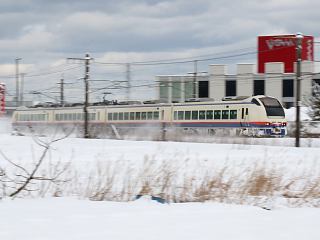 間もなく、約5分遅れの「しらゆき」が目の前を通過します。ご覧のように、雪は止んでいた──雪が降っているとカメラが濡れる──のでミラーレスカメラを取り出しました。装着していたレンズは年末に買った望遠(中古)。困ったことに、周囲に電柱など撮影の障害になる物が多すぎます。