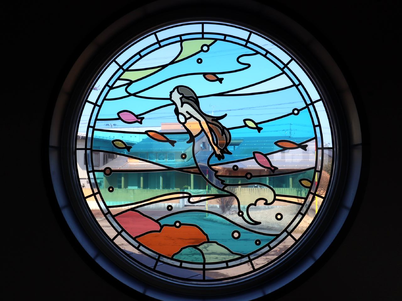 駅舎内から撮影したのが写真のステンドグラス。(拡大写真(別ウィンドウ、1280×960))気をつけていれば電車内から見ることができます。