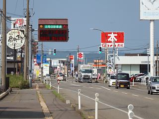 本降りになるほどではなかったのですが、降り始めた雨と競争しながら建物内へ。ロッカーに残す荷物と持ち帰るものを整理して、9時過ぎに出発。昨日同様、あるいは昨日以上に走行は順調。新潟県に入ったところで電光掲示板の表示に気がつきました。ちょっと想定していなかった内容。