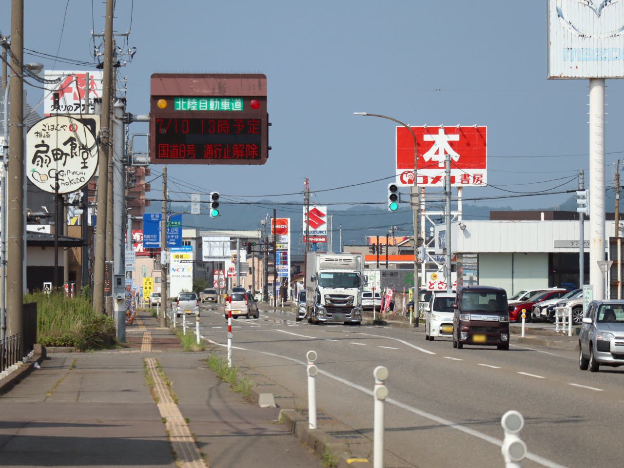 「7/10 13時予定 北陸自動車道無料措置終了」。電光掲示板で一度に表示できる情報量は限られているため、他地域の方にはピンと来ないかもしれません。でも地域住民にとって、このメッセージが意味する内容は明白。5月に発覚した国道8号線「上輪橋」一部損傷に伴う通行止めが解除されるのです。(報道例)