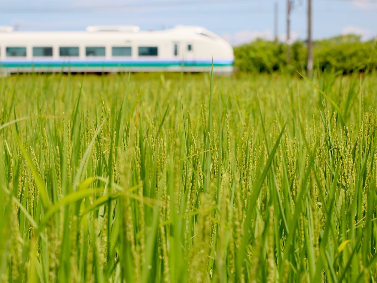 写真はお昼に外出した際に撮影したもの。奥の特急「しらゆき」はたまたま通過したため撮影したものです。主役はその手前の稲。数日前に気づいたのですが、穂が出始めています。(拡大写真(別ウィンドウ、1280×960))