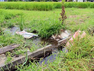 ここがその現場。(拡大写真(別ウィンドウ、1280×960))手前左から右に向かって用水路をたくさんの水が流れていきます。その流れを、右側の薄茶色の簡易土嚢(どのう)──肥料袋に土を詰めたもの──で遮り、中央奥の田圃へ流しているのです。渇水状況下でこれだけ見ると、不法行為を想像されるかも。