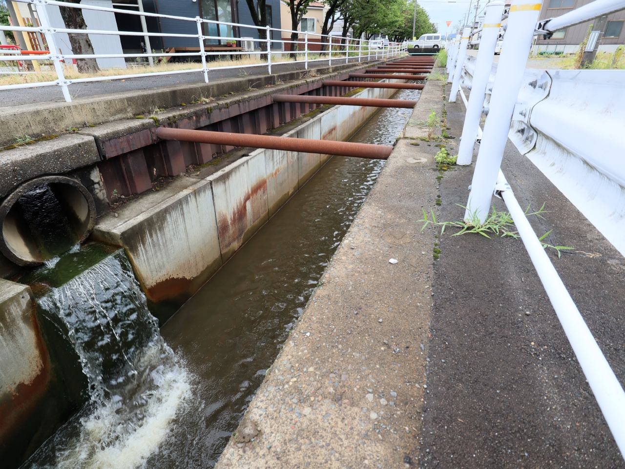 実際、どこの田圃も水で満たされており、稲(および雑草)はホントに嬉しそう。でもそれ以外の場所に降った雨は順次、川に集まってきます。さぞや川は濁った大量の水で...と思って現地を訪れると、確かにそれらしき音。でも確認すると、音の出所は隣接する工業団地に降った雨が「よしやぶ川」に流れ込む際の音。(実話)