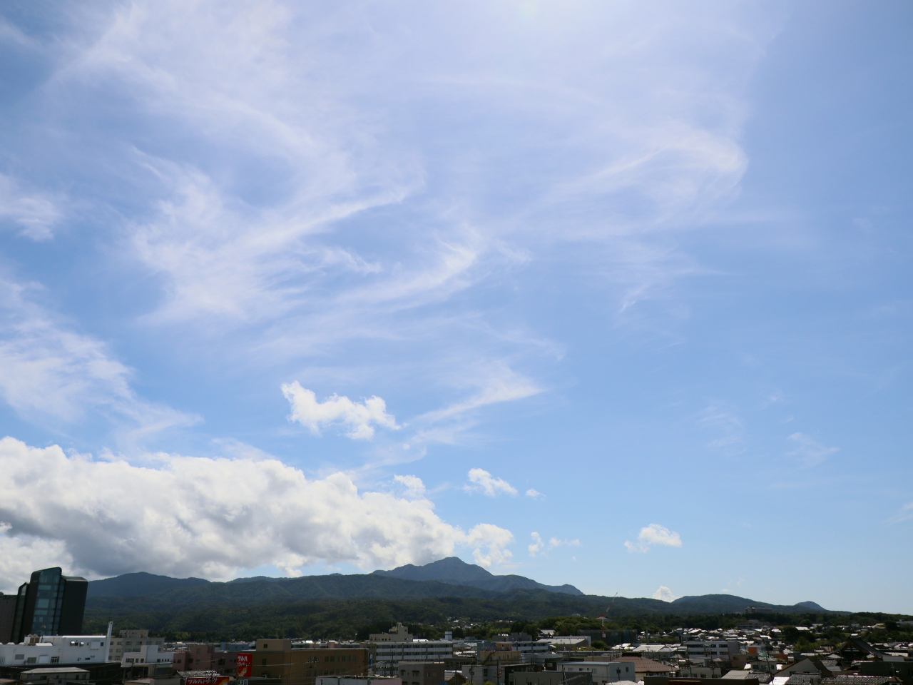 「○○は高い所が好き」らしいので、公共の場で高い場所で撮影したのが写真。(拡大写真(別ウィンドウ、1280×960))旧市街地中心部から、南西方向──写真中央下部は、当地域のシンボル「米(よね)山」(992m)──を見ています。上空に目を向けると、中央上部には高い雲。巻雲(/絹雲:けんうん)でしょう。澄んでおり、不安定な感じはない。