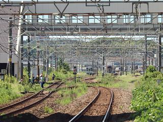 最初は「安全確認をしながら線路脇の除草をしているなぁ...」と思ったのです。でも良く見ると写真中央奥、待避側線にJRの塗装ではない電車が。