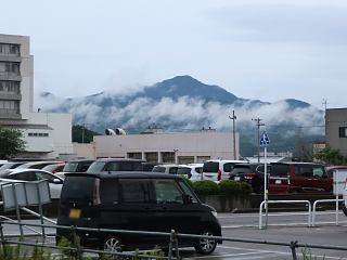 未明から今朝10時頃まで雨は降り続いたものの、基本的には「シトシト」という感じ。風も強くなかったし。写真はお昼前、徒歩で外出した際に気づいて撮影したもの。地域の基幹病院(写真左)と並んで、当地域のシンボル「米(よね)山」(992m)を見ています(拡大写真(別ウィンドウ、1280×960))。地面は濡れていますが、大降りではありません。