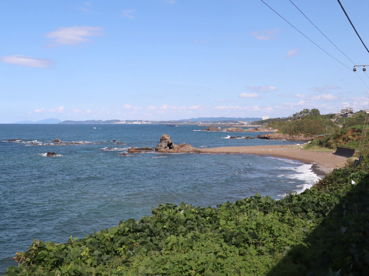 左端から、微かに見えているのが角田山および弥彦山。その右隣、色がかなり濃くなっている部分は柏崎市椎谷地区(こちらおよびこちら)。水平線上、中央やや左寄りに見えるのは東京電力柏崎刈羽原子力発電所。(その付近からだと、当地近辺はこのように見える)