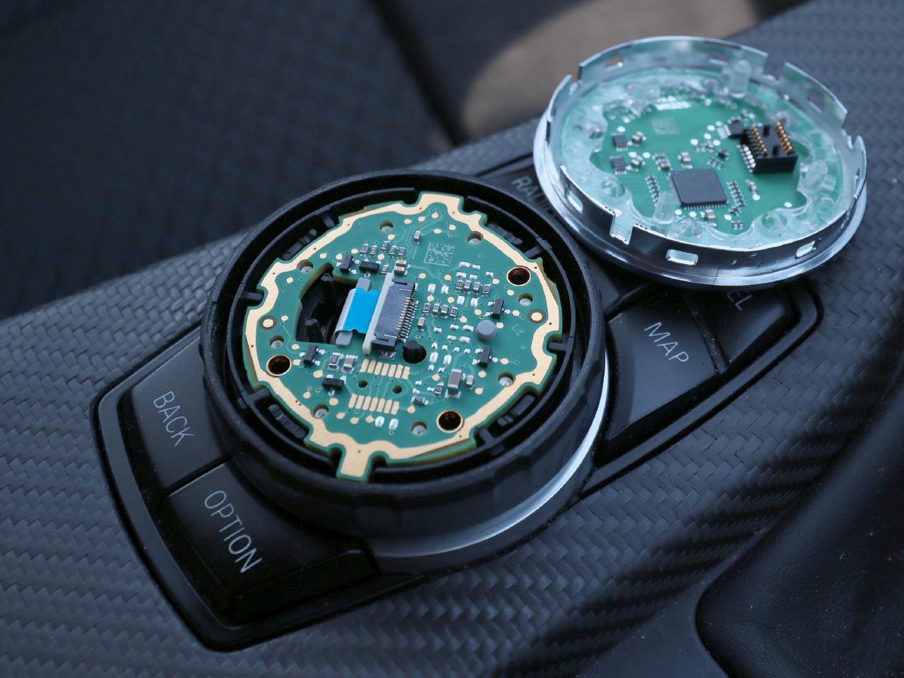 カーナビに相当するBMWの“iDrive”(表示部)のダイヤルコントロールの蓋が外れたのです。もちろん、重さのために十分持ち上げることができなかった鞄が蓋に引っかかったのでしょう。すぐに戻そうとしたのですが、そんなに簡単ではなさそう。