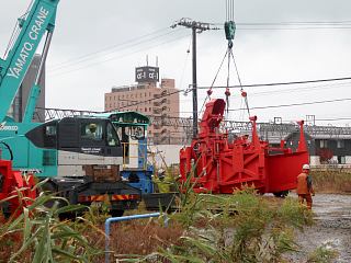 最近の写真とちょっと雰囲気が違うのはそのため。(ただしレンズが明るく、しかもかなりの高性能)似たような色が重なっているためちょっとわかりづらいのですが、右の写真は左手前のクレーン車がロータリーヘッドを吊り上げているところ。(拡大写真(別ウィンドウ、1280×960))