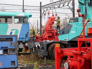 この機構を通じてモータカーから除雪装置を駆動、操作する動力が伝えられます。3枚目の写真は、さらに移動して作業のほぼ全体像を撮影したもの。中央の青っぽい車両が「モータカー」。その左側にはラッセルヘッドを装着済。(拡大写真(別ウィンドウ、1280×960))