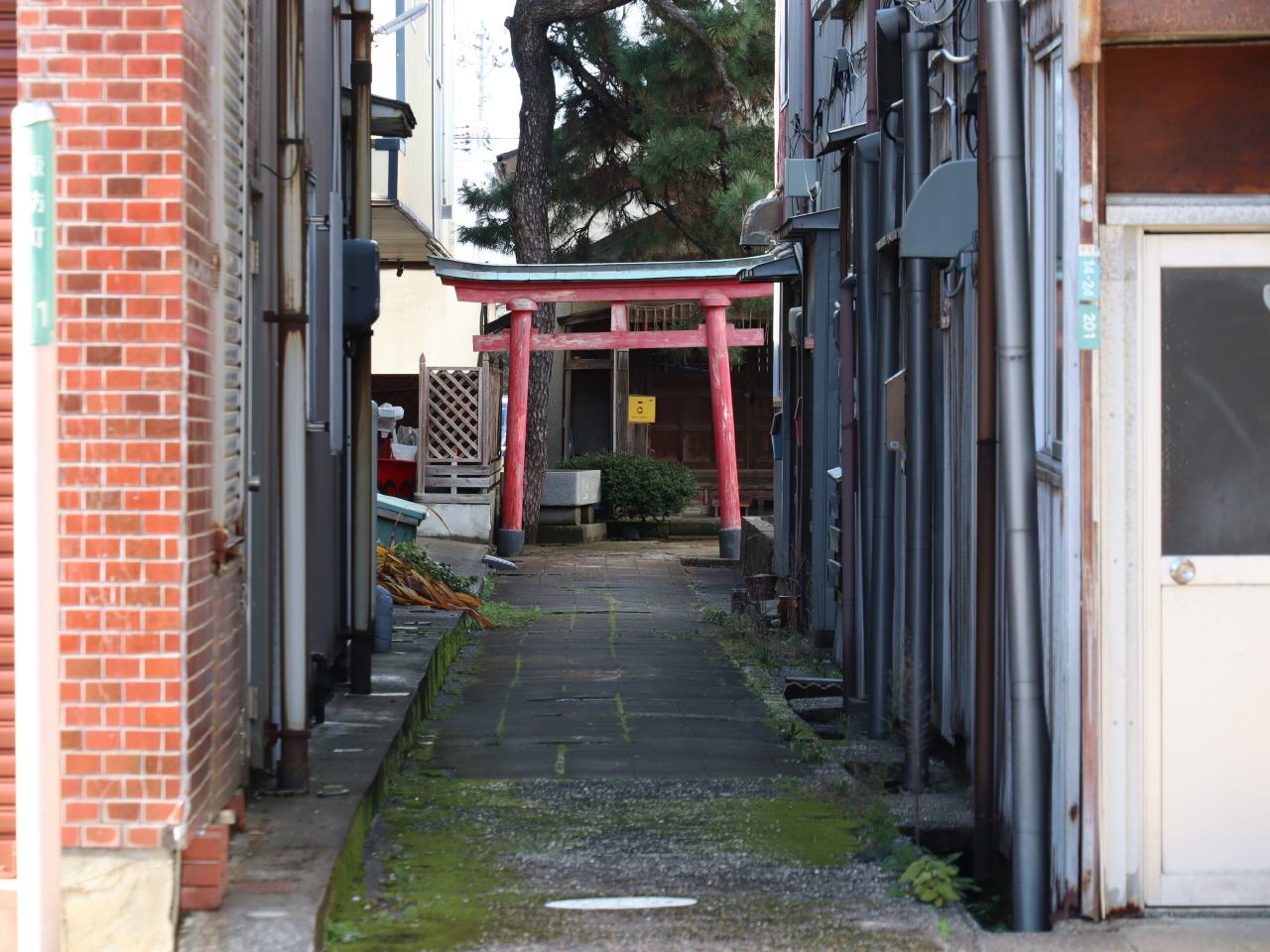 気づいた時の、「奥に何かが...」という印象に近い。ただし、その存在に気づいて対象を凝視する時とは違います。そこで後日、この「諏訪町稲荷社」を道路を挟んだ反対側から、「梅」望遠レンズを使って撮影したのが右の写真。(拡大写真(別ウィンドウ、1280×960))