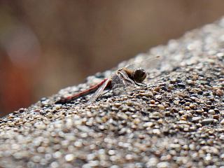 でもそれも、先月いっぱい。11月に入ると、パタッとその姿を見かけなくなりました。当然のことなのですが、そのような状況下で見かけた赤トンボ。どうするんだろうと思っていたら、1匹がコンクリート製の塀の上に止まりました。
